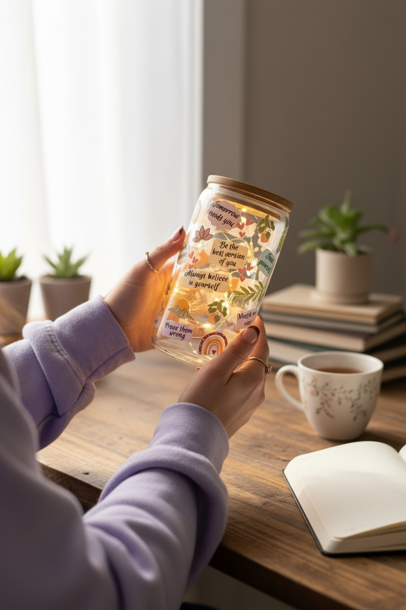 - Custom 16oz glass iced coffee cup with a high-quality, 'The One That Motivated Me' UVDTF design